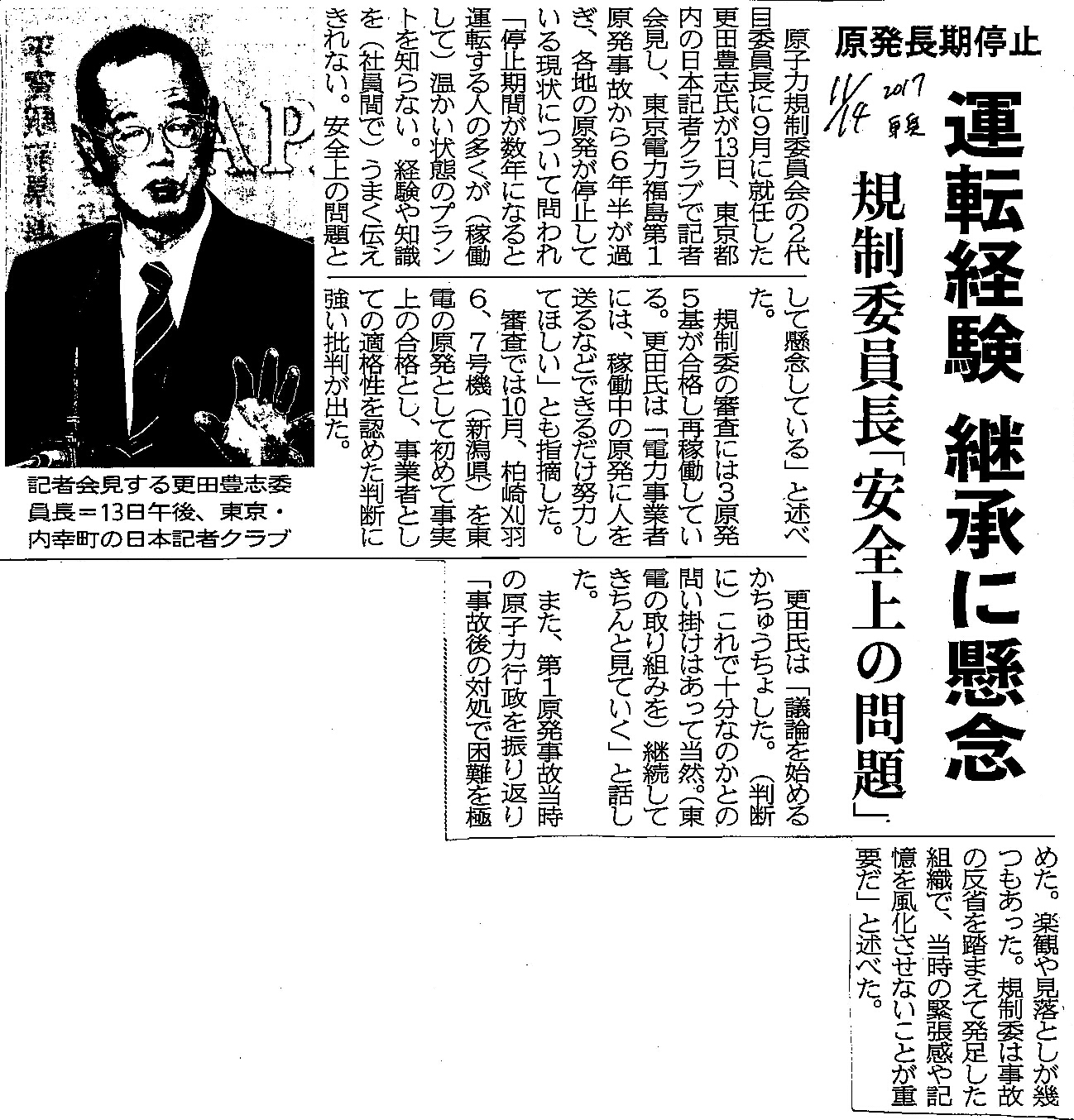 [2017_11_14_10]原発長期停止 運転経験 継承に懸念 規制委員長「安全上の問題」(東奥日報2017年11月14日)