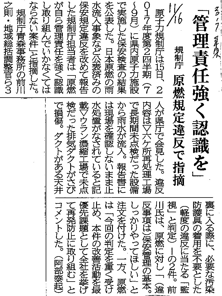 | [2017_11_16_04]「管理責任強く認識を」 規制庁 原燃規定違反で指摘(東奥日報2017年11月16日) |