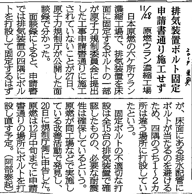 | [2017_11_28_09]排気装置ボルト固定 申請書通り施工せず 原燃ウラン濃縮工場(東奥日報2017年11月28日) |