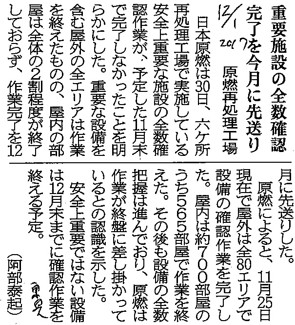 | [2017_12_01_04]重要施設の全数確認完了を今月に先送り 原燃再処理工場(東奥日報2017年12月1日) |
