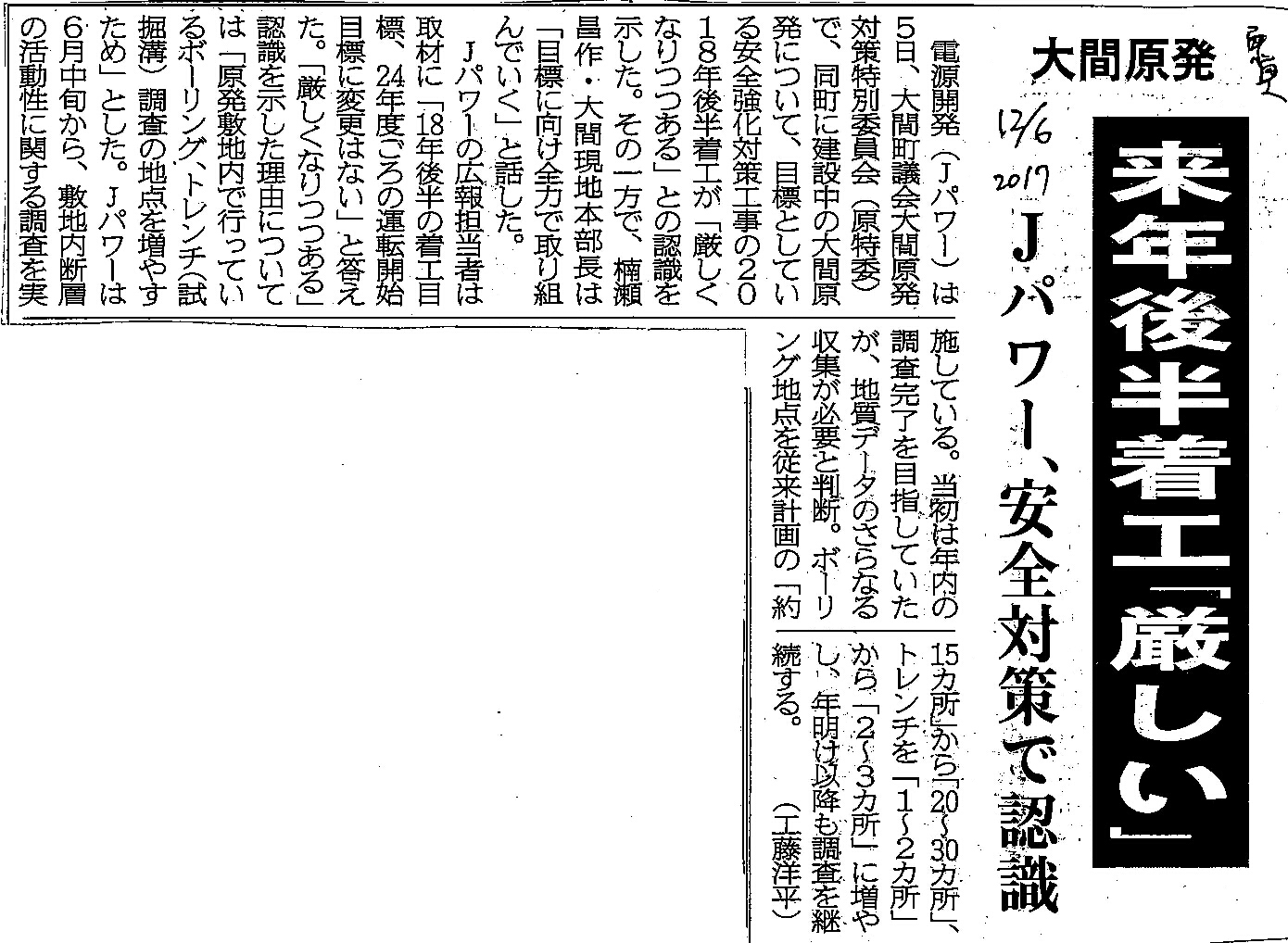 [2017_12_06_04]大間原発 来年後半着工「厳しい」 Jパワー、安全対策で認識(東奥日報2017年12月6日)