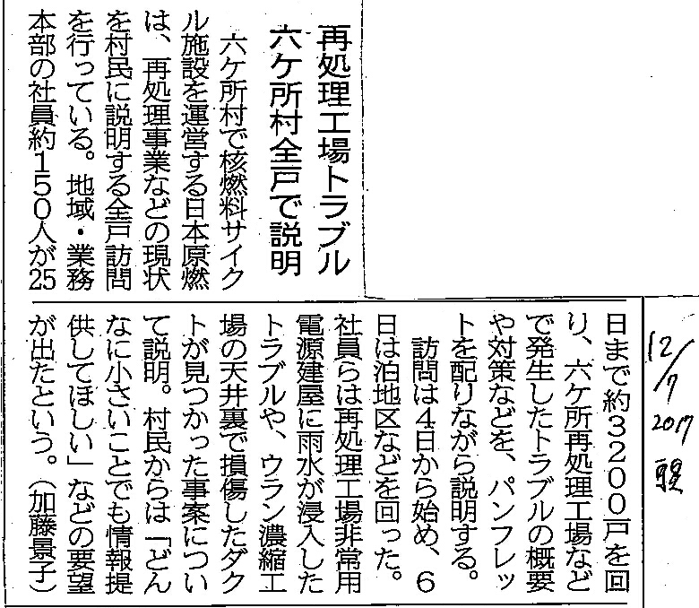 | [2017_12_07_03]再処理工場トラブル 六ケ所村全戸で説明(東奥日報2017年12月7日) |