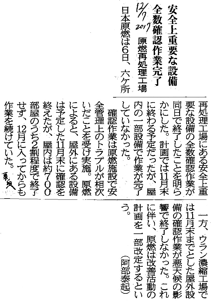 | [2017_12_07_04]安全上重要な設備 全数確認作業終了 原燃再処理工場(東奥日報2017年12月7日) |