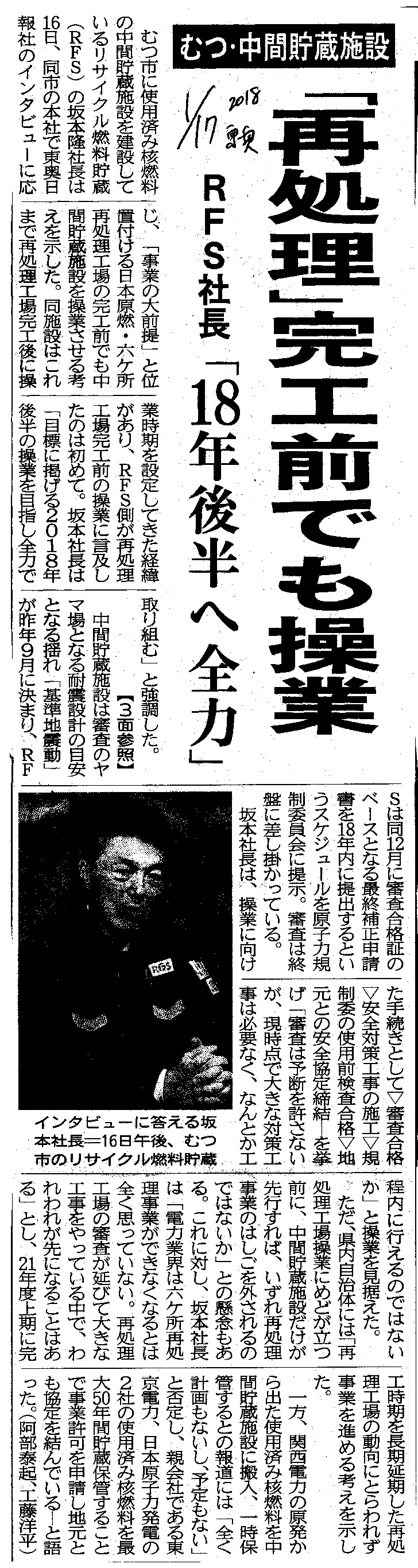 | [2018_01_17_05]むつ・中間貯蔵施設 「再処理」完工前でも操業 RFS社長「18年後半へ全力」(東奥日報2018年1月17日) |