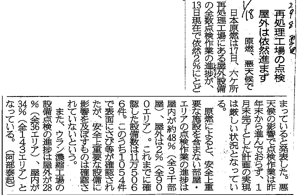 | [2018_01_18_04]再処理工場の点検 屋外は依然進まず 原燃、悪天候で(東奥日報2018年1月18日) |