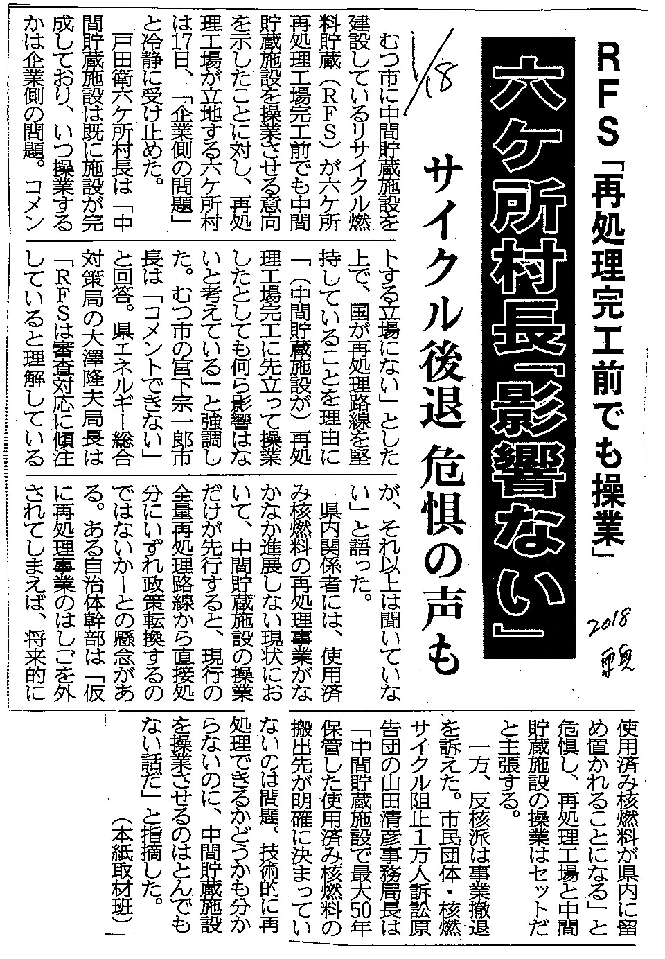 | [2018_01_18_05]RFS「再処理完工前でも操業」 六ヶ所村長「影響ない」 サイクル後退 危惧の声も(東奥日報2018年1月18日) |