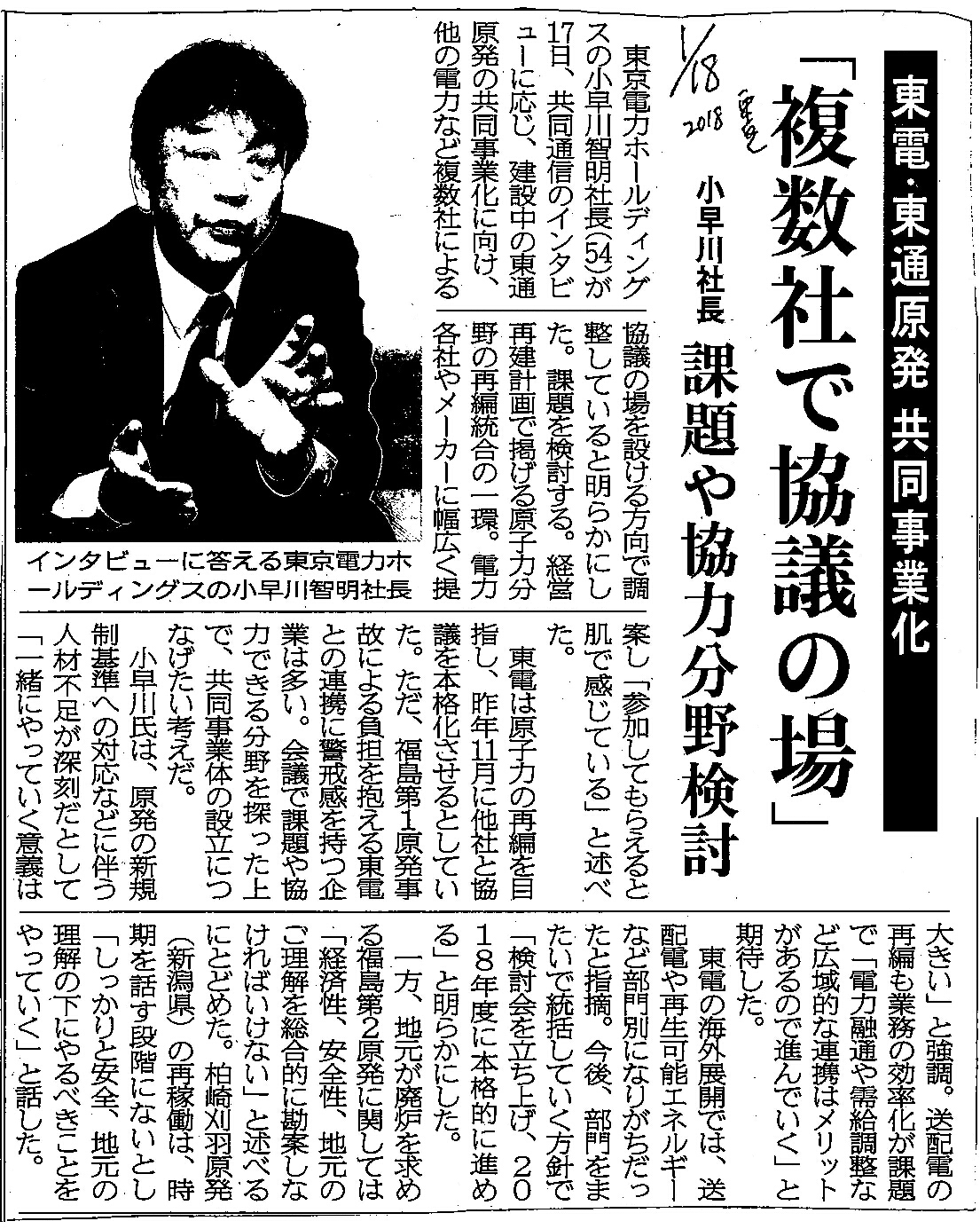 [2018_01_18_06]東電・東通原発 共同事業化 「複数社で協議の場」 小早川社長 課題や協力分野検討(東奥日報2018年1月18日)