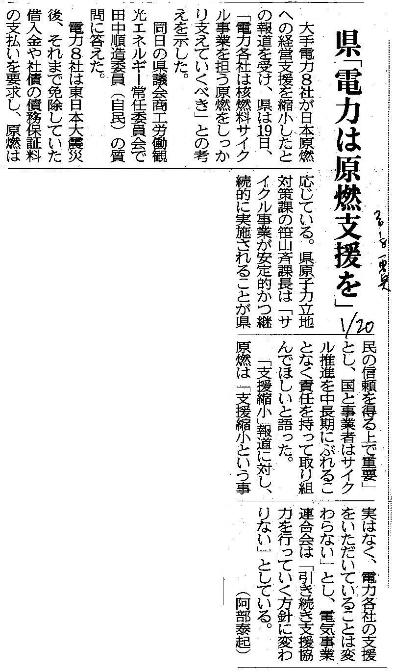 [2018_01_20_03]県「電力は原燃支援を」(東奥日報2018年1月20日)