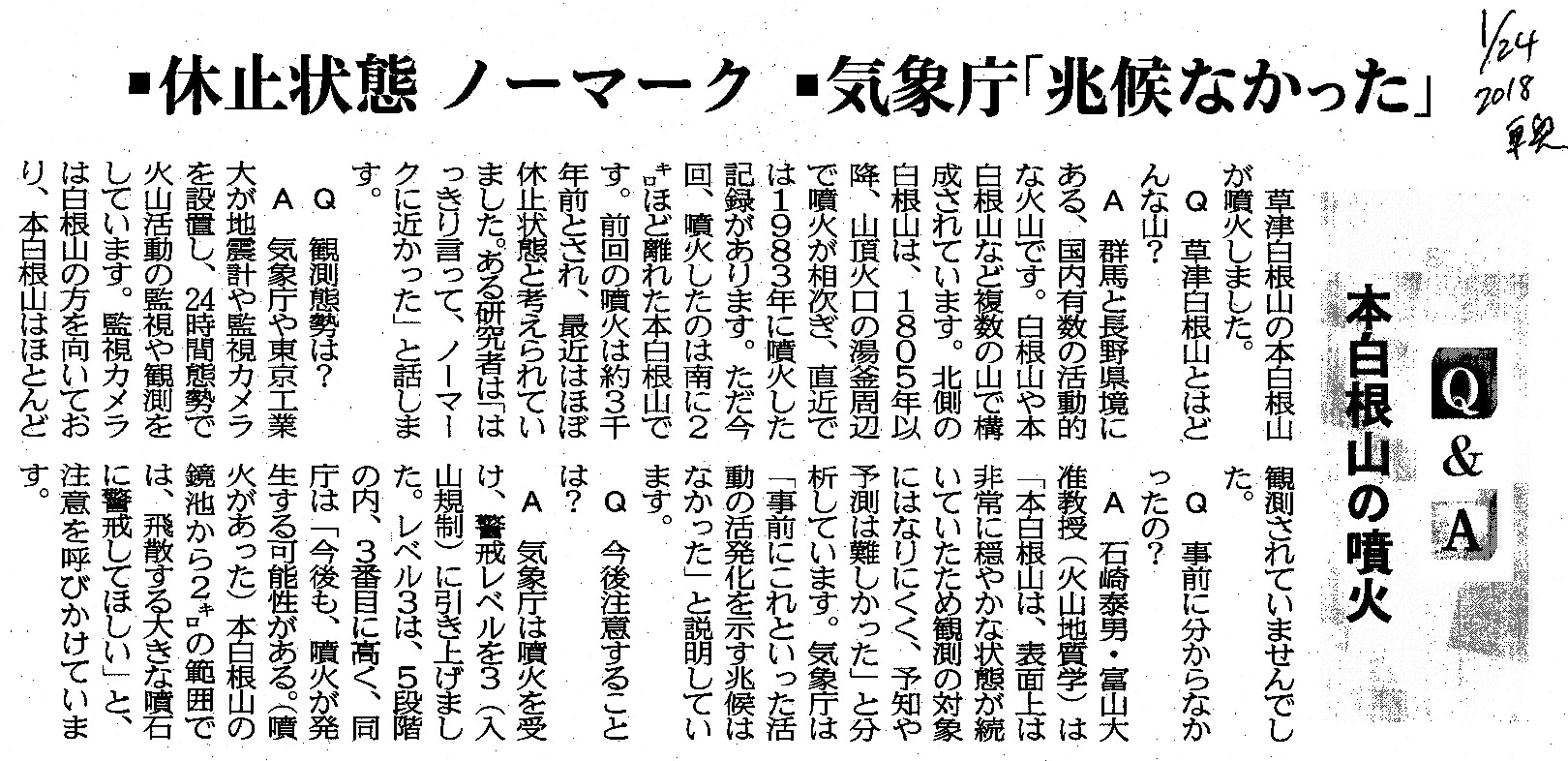 [2018_01_24_07]本白根山の噴火 休止状態 ノーマーク 気象庁「兆候なかった」(東奥日報2018年1月24日)