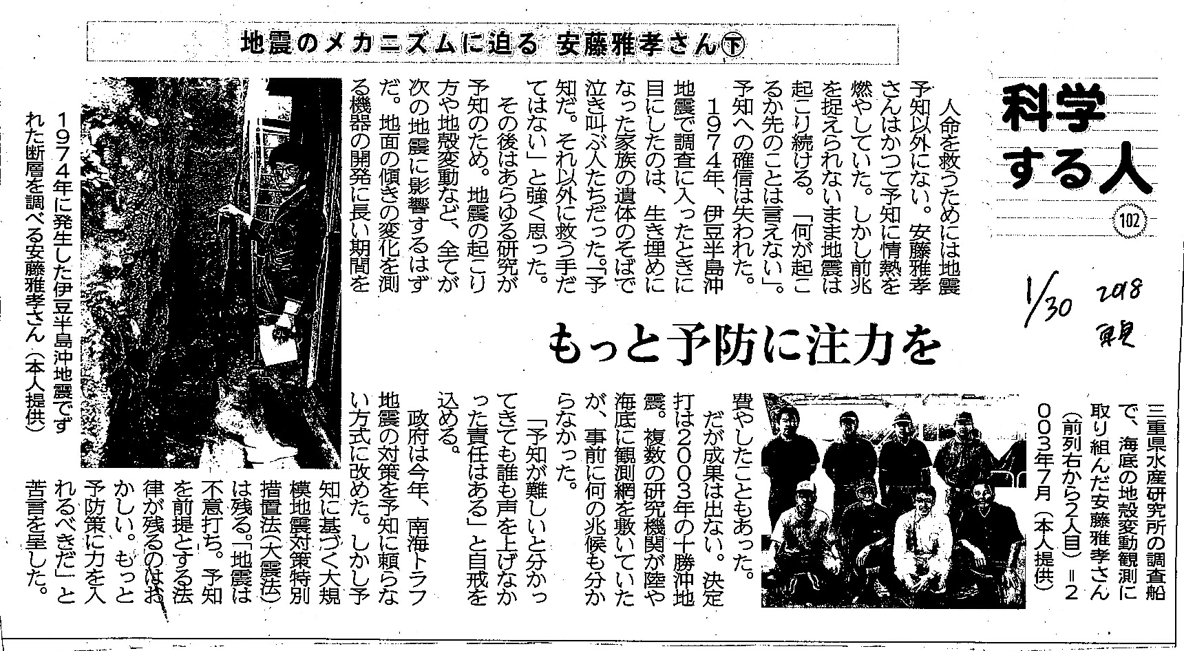 [2018_01_30_07]地震のメカニズムに迫る 安藤雅孝さん(下) 科学する人 102 もっと予防に注力を(東奥日報2018年1月30日)