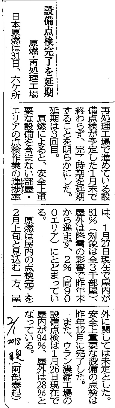 | [2018_02_01_03]設備点検完了を延期 原燃・再処理工場(東奥日報2018年2月1日) |
