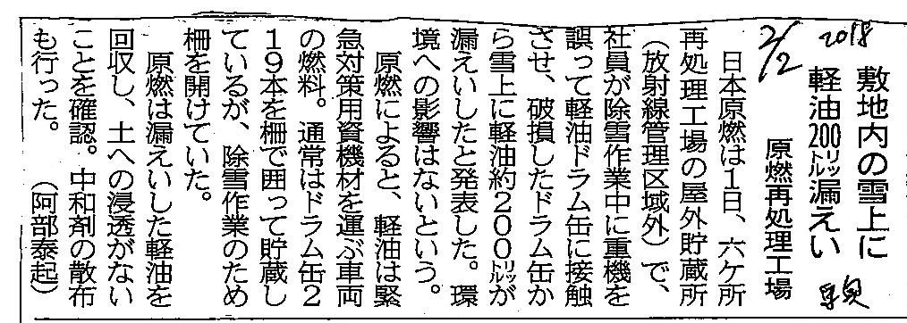 | [2018_02_02_05]敷地内の雪上に軽油200リットル漏えい 原燃再処理工場(東奥日報2018年2月2日) |