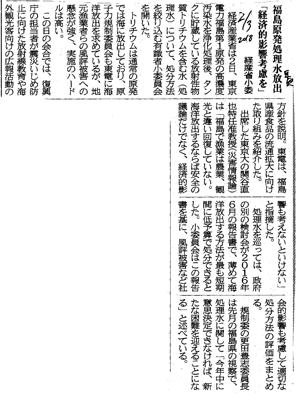 | [2018_02_03_02]福島原発処理水放出「経済的影響考慮を」 経産省小委(東奥日報2018年2月3日) |