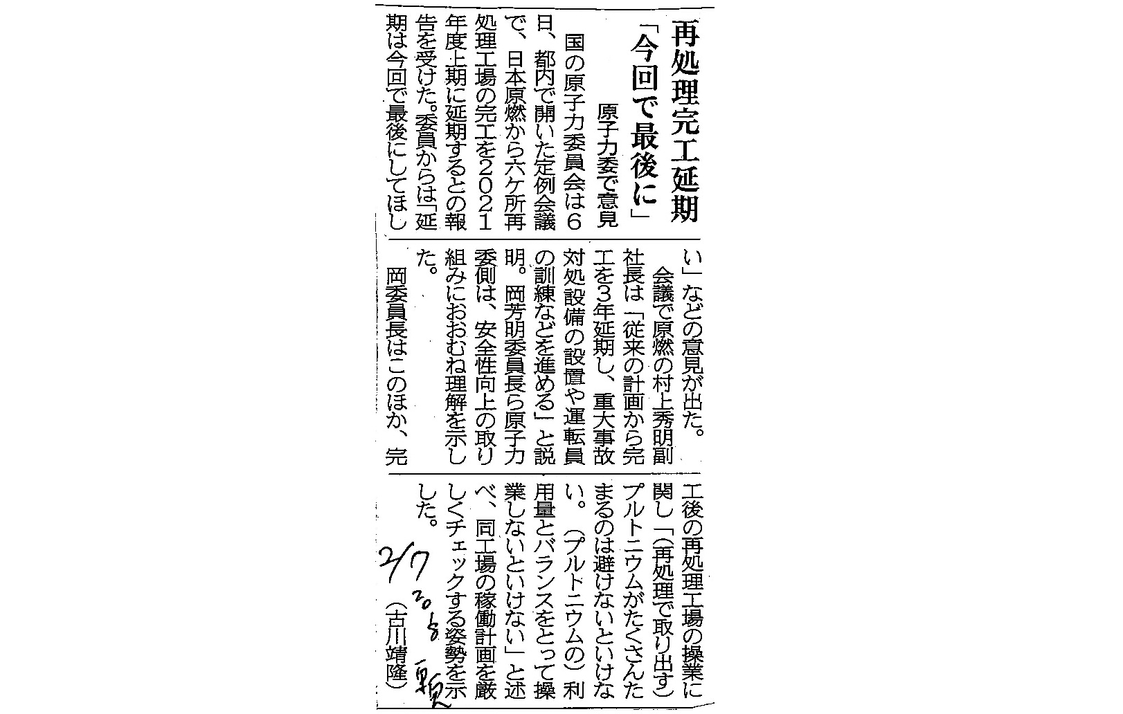 国の原子力委員会は6日、都内で開いた定例会議で、日本原燃から六ヶ所再処理工場の完エを2021年度上期に延期するとの報告を受けた。委員からは「延期は今回で最後にしてほしい」などの意見が出た。