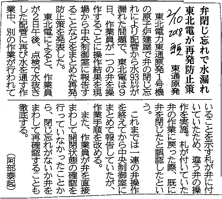 | [2018_02_10_05]弁閉じ忘れで水漏れ 東北電が再発防止策 東通原発(東奥日報2018年2月10日) |