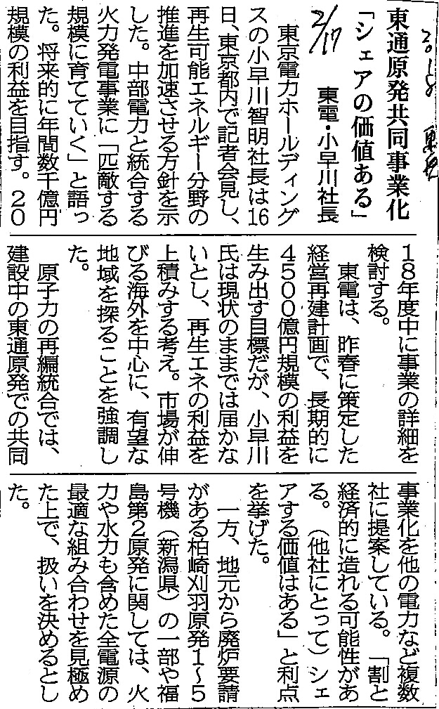 | [2018_02_17_04]東通原発共同事業化 「シェアの価値ある」 東電・小早川社長(東奥日報2018年2月17日) |