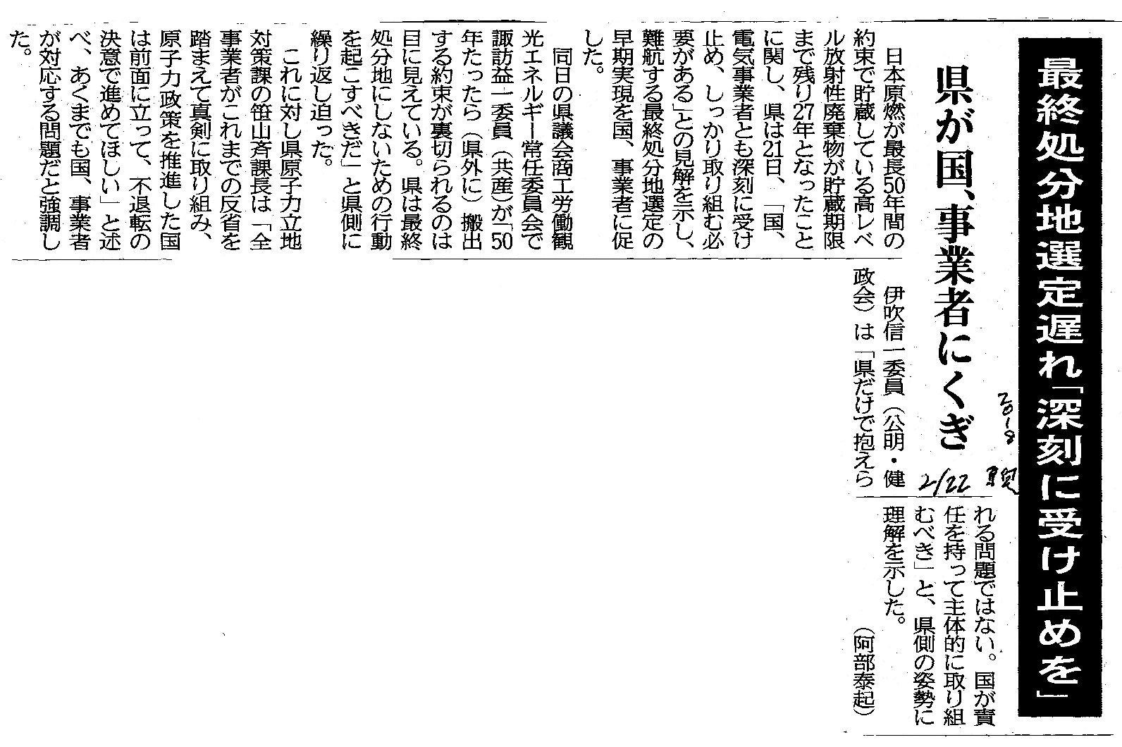 [2018_02_22_03]最終処分地選定遅れ「深刻に受け止めを」 県が国、事業者にくぎ(東奥日報2018年2月22日)