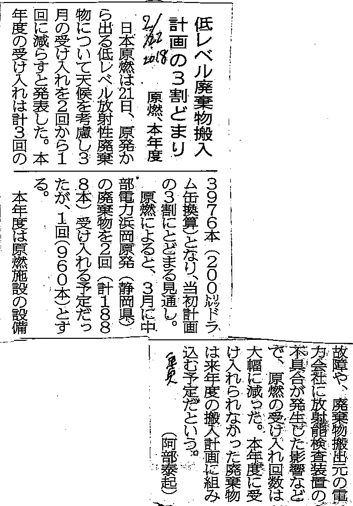 | [2018_02_22_04]低レベル廃棄物搬入 計画の3割どまり 原燃、本年度(東奥日報2018年2月22日) |