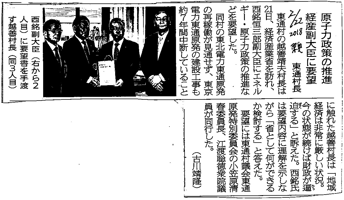 | [2018_02_22_05]原子力政策の推進 経産副大臣に要望 東通村長(東奥日報2018年2月22日) |