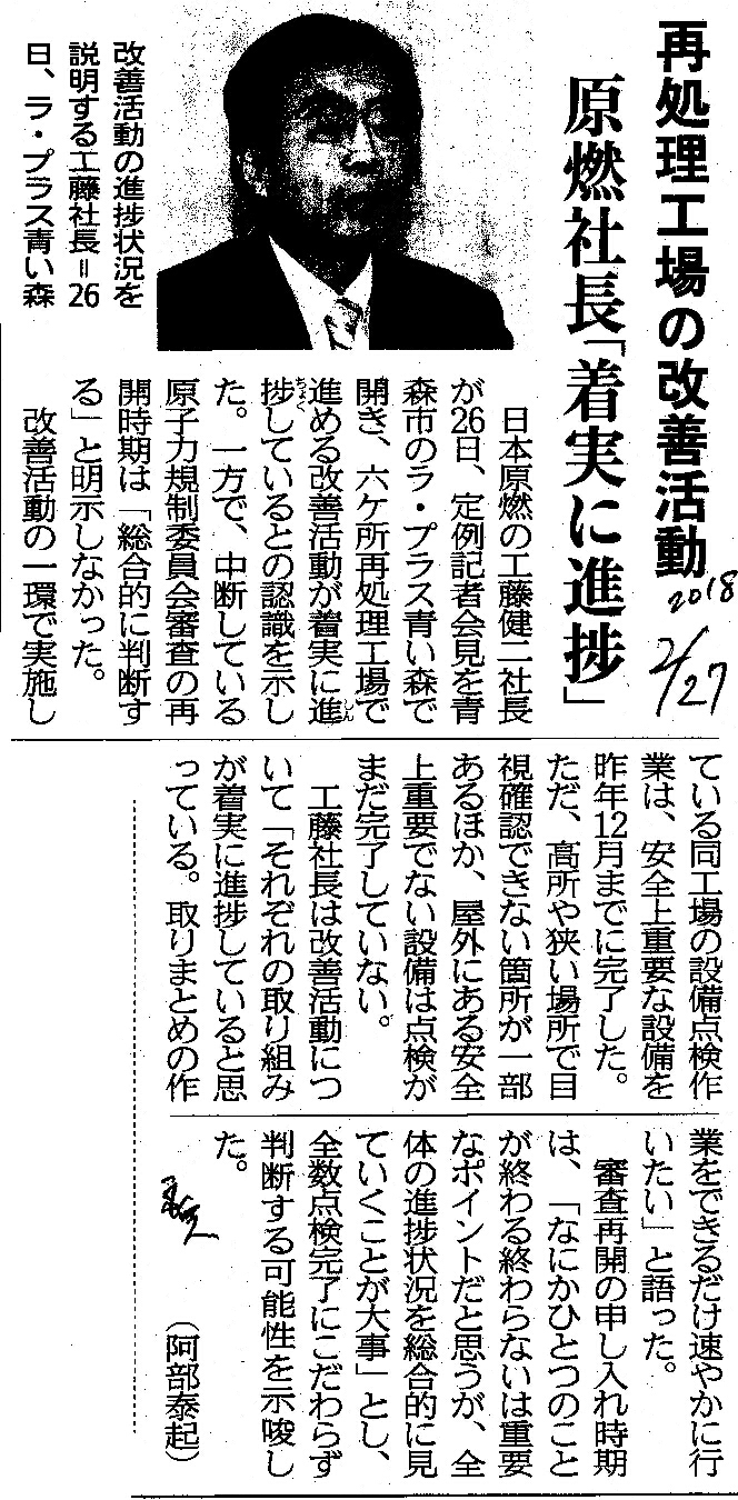 | [2018_02_27_04]再処理工場の改善活動 原燃社長「着実に進捗」(東奥日報2018年2月27日) |