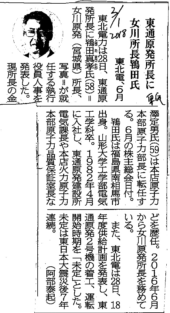 | [2018_03_01_02]東通原発所長に女川所長 鴇田(ときた)氏 東北電、6月(東奥日報2018年3月1日) |