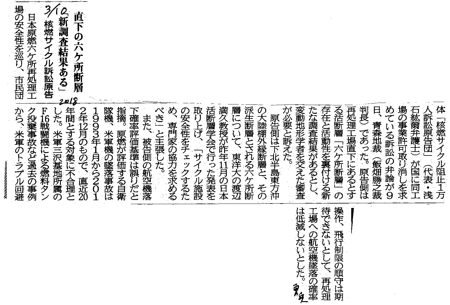 | [2018_03_10_02]直下の六ケ所断層「新調査結果ある」 核燃サイクル訴訟原告(東奥日報2018年3月10日) |