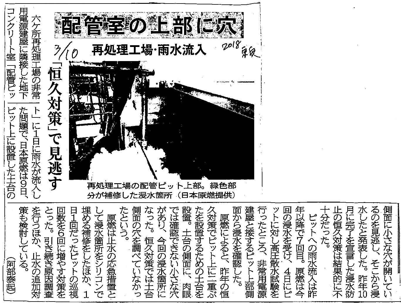 | [2018_03_10_03]配管室の上部に穴 再処理工場・雨水流入 「恒久対策」で見逃す(東奥日報2018年3月10日) |