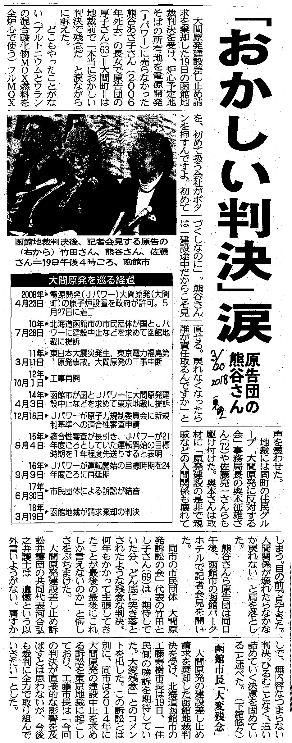 | [2018_03_20_05]「おかしい判決」 涙 原告団の熊谷さん 函館市長「大変残念」(東奥日報2018年3月20日) |