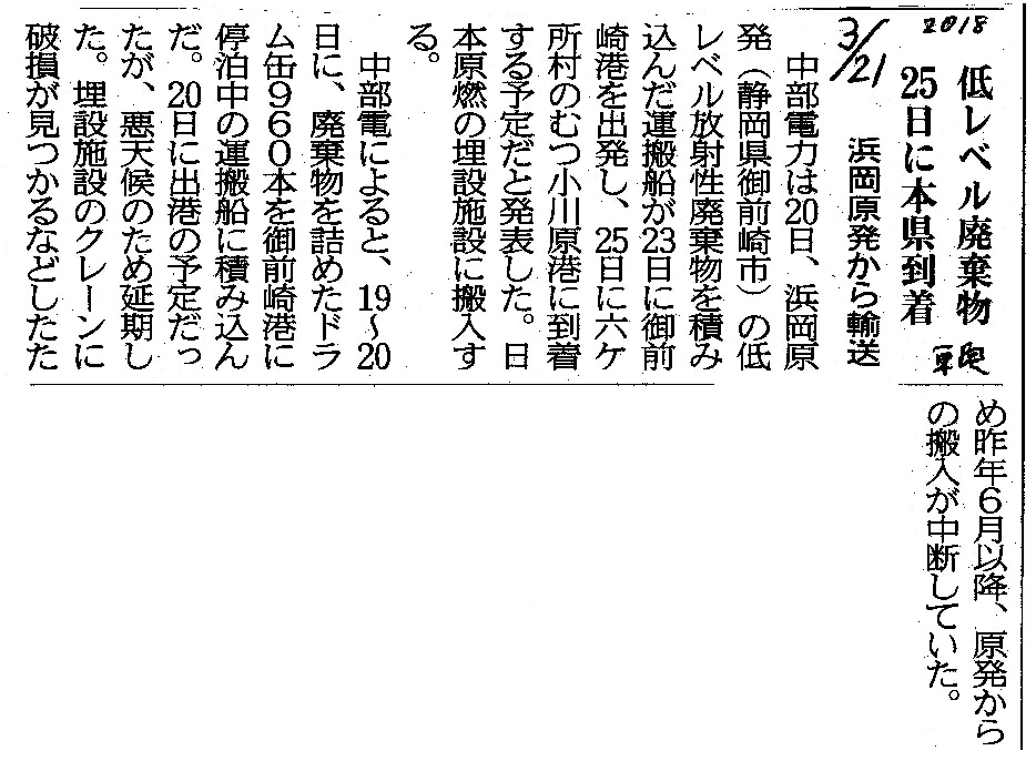 | [2018_03_21_03]低レベル廃棄物 25日に本県到着 浜岡原発から輸送(東奥日報2018年3月21日) |