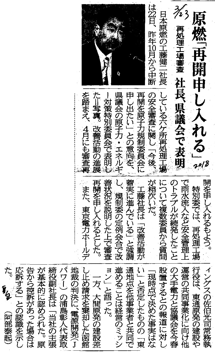 | [2018_03_23_03]原燃「再開申し入れる」 再処理工場審査 社長、県議会で表明(東奥日報2018年3月23日) |