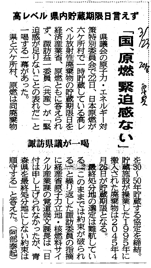 | [2018_03_23_04]高レベル 県内貯蔵期限日言えず 「国、原燃 緊迫感ない」 諏訪県議が一喝(東奥日報2018年3月23日) |
