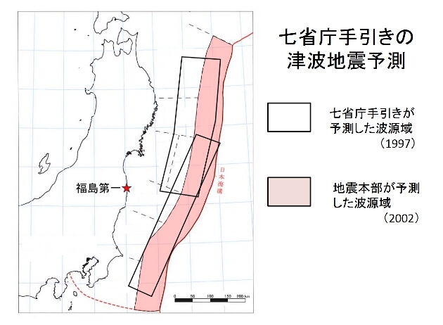 ※引用者注:以下の図は参照元(原発と大津波_警告を葬った人々_もっかい事故調_オープンセミナー_添田孝史)の39ページ目の抜粋である。七省庁とは国土庁・農林水産省構造改善局・農林水産省水産庁・運輸省・気象庁・建設省・消防庁である。