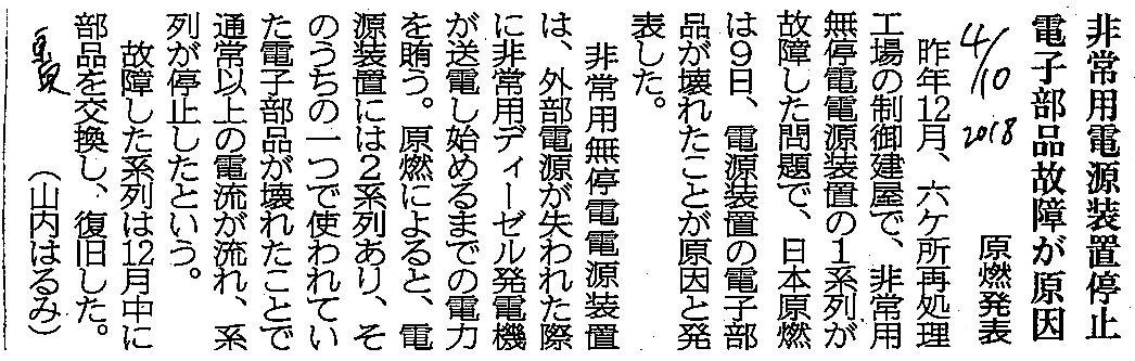 | [2018_04_10_06]非常用電源装置停止 電子部品故障が原因 原燃発表(東奥日報2018年4月10日) |