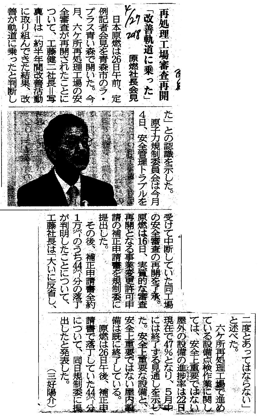 | [2018_04_27_03]再処理工場審査再開 「改善軌道に乗った」 原燃社長会見(東奥日報2018年4月27日) |