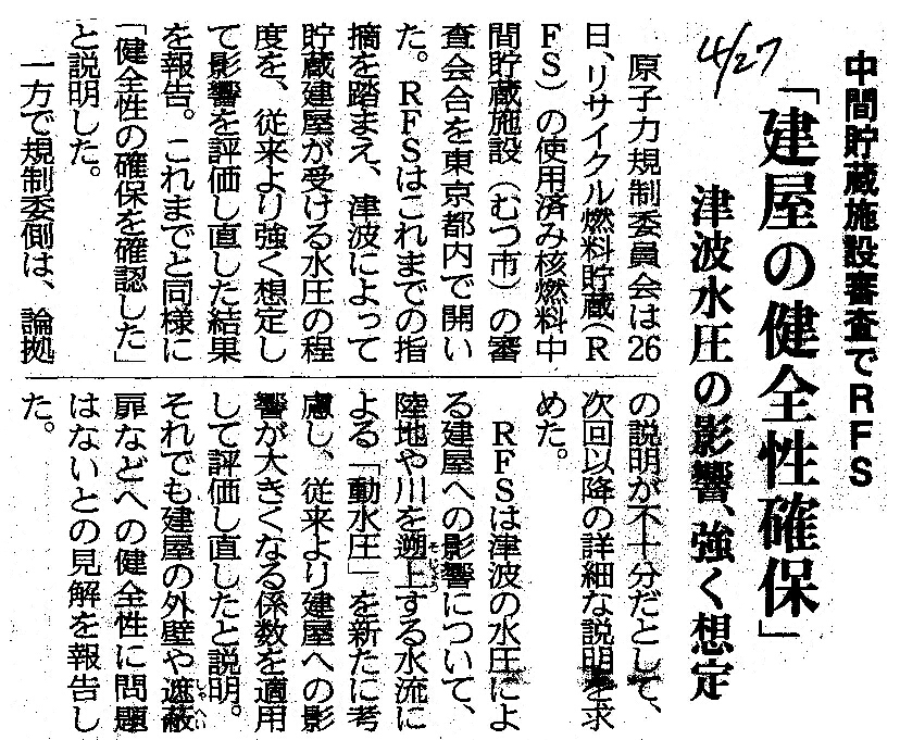 | [2018_04_27_04]中間貯蔵施設審査でRFS 「建屋の健全性確保」 津波水圧の影響、強く想定(東奥日報2018年4月27日) |