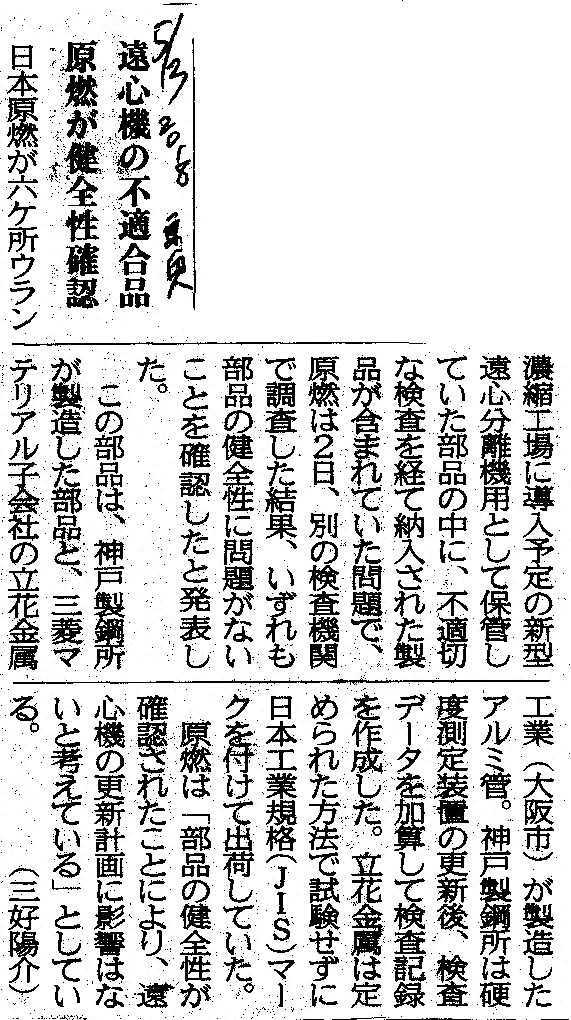 この部品は、神戸製鋼所が製造した部品と、三菱マテリアル子会社の立花金属工業(大阪市)が製造したアルミ管。神戸製鋼所は硬度測定装置の更新後、検査データを加算して検査記録を作成した。立花金属は定められた方法で試験せずに日本工業規格(JIS)マークを付けて出荷していた。 原燃は「部品の健全性が確認されたことにより、遠心機の更新計画に影響はないと考えている」としている。(三好陽介) |