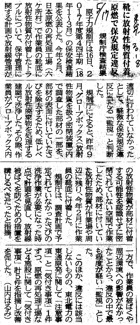 | [2018_05_17_03]靴に放射性物質付着 原燃で保安規定違反 規制庁検査結果(東奥日報2018年5月17日) |