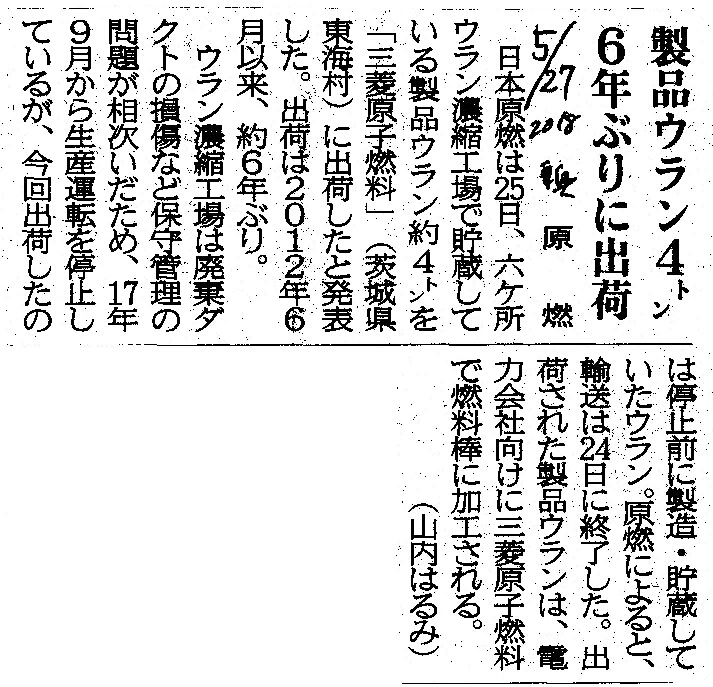 | [2018_05_27_01]製品ウラン4トン 6年ぶりに出荷(東奥日報2018年5月27日) |