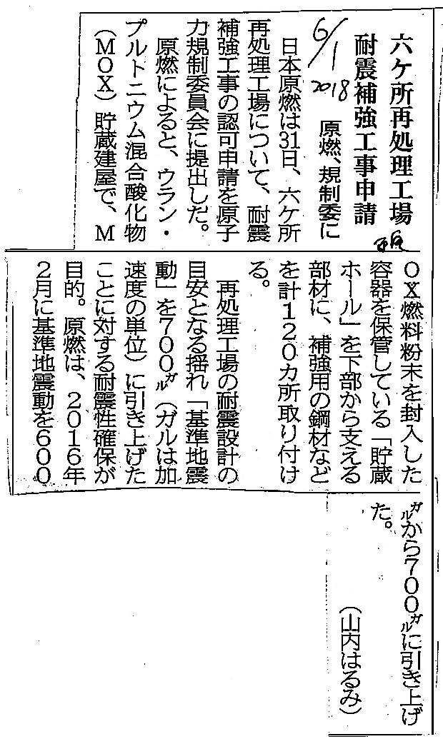 | [2018_06_01_02]六ヶ所再処理工場 耐震補強工事申請 原燃、規制委に(東奥日報2018年6月1日) |