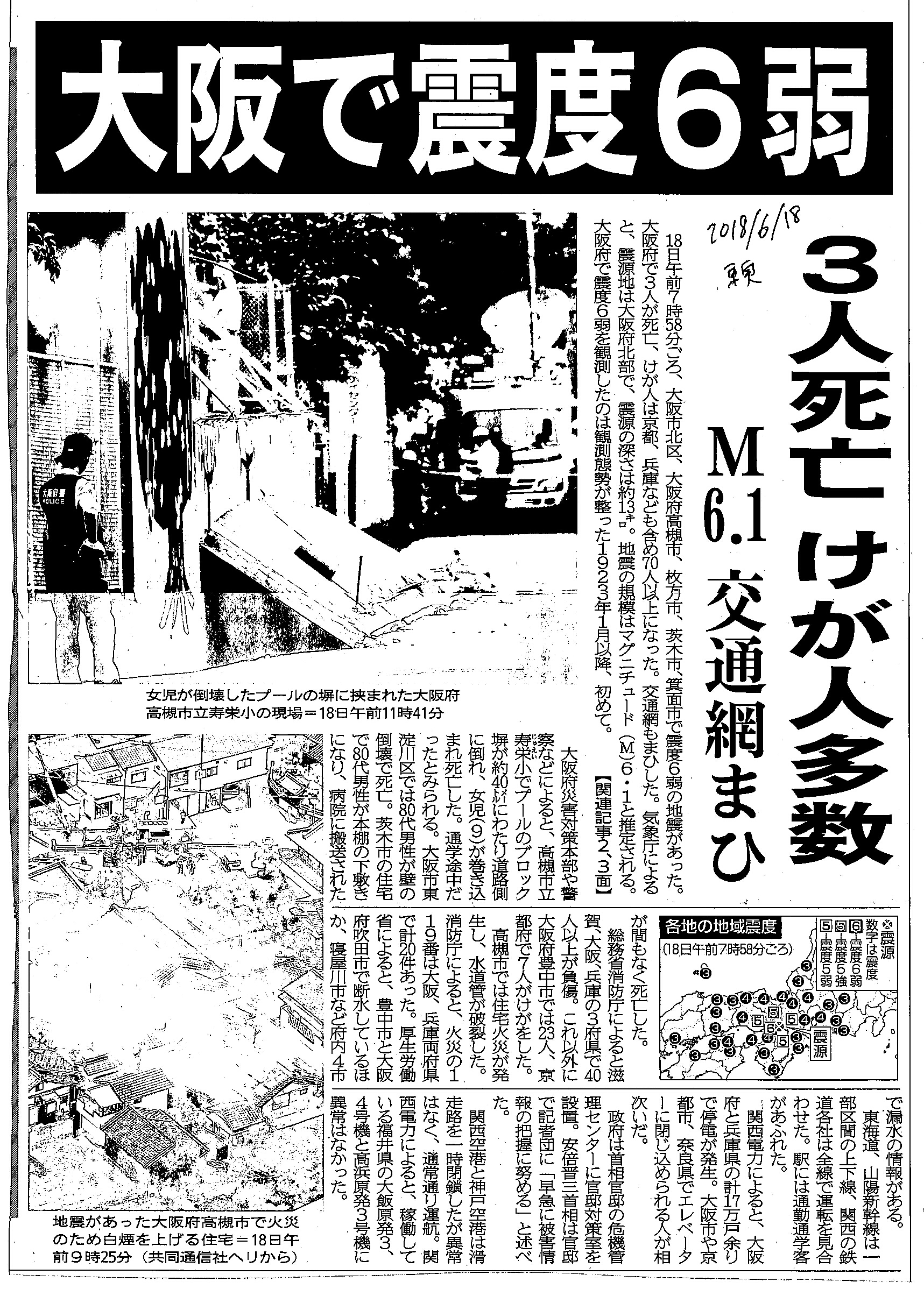 [2018_06_18_04]大阪で震度6弱 3人死亡 けが人多数 M6.1 交通網まひ(東奥日報2018年6月18日)