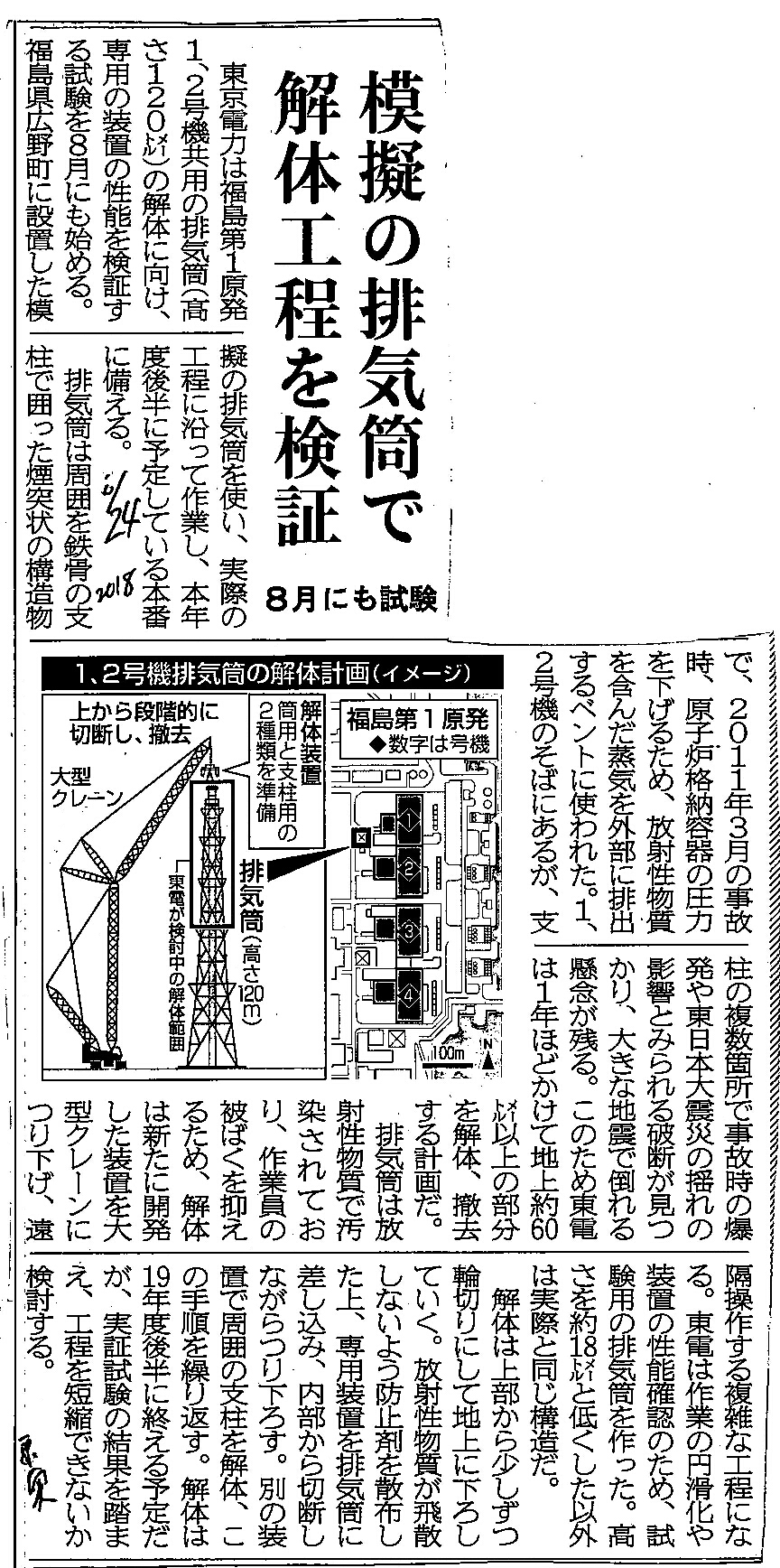 [2018_06_24_01]模擬の排気筒で解体工程を検証 8月にも試験(東奥日報2018年6月24日)