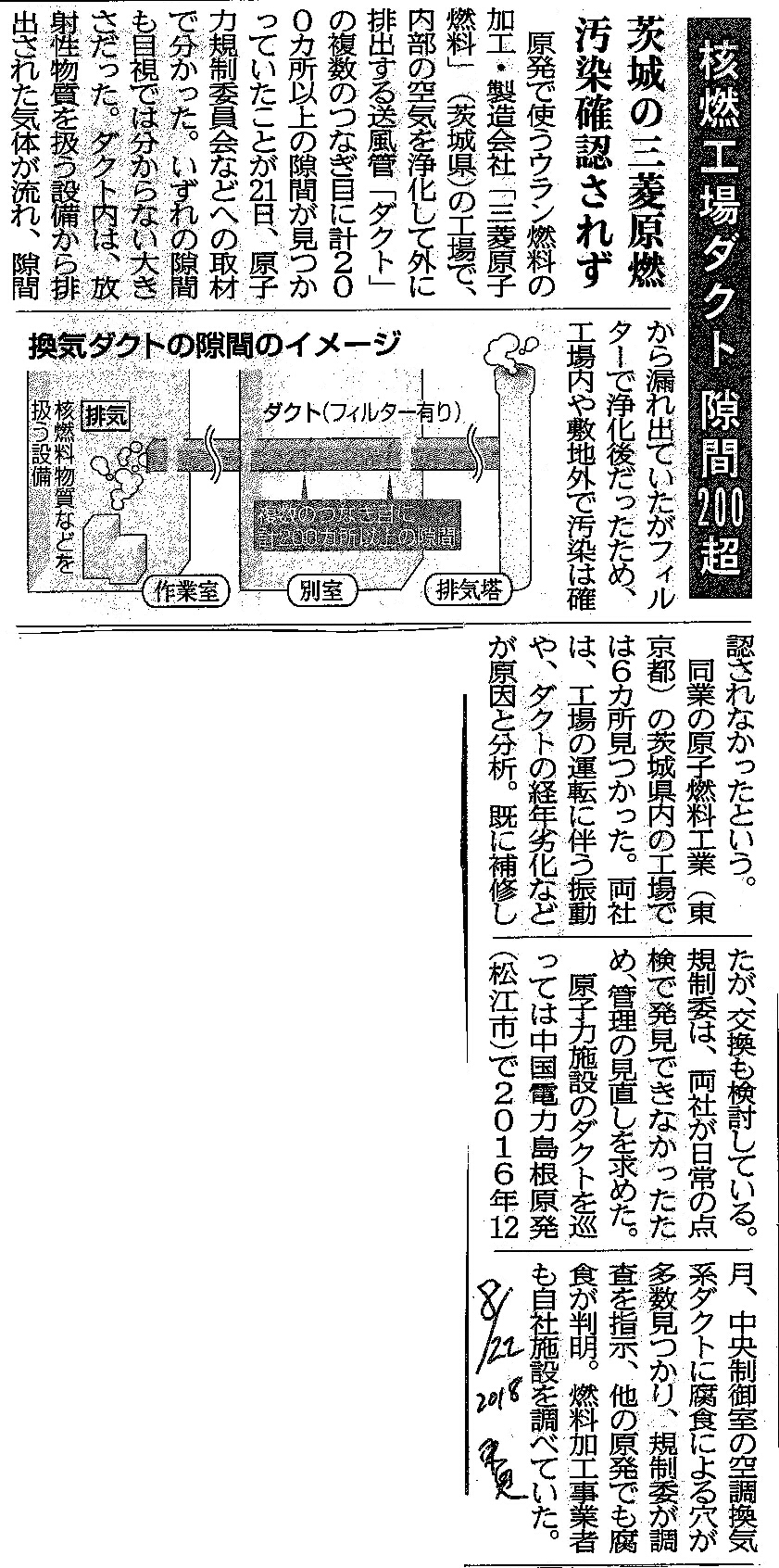 [2018_08_22_06]核燃料ダクト 隙間200超 茨城の三菱原燃汚染確認されず(東奥日報2018年8月22日)