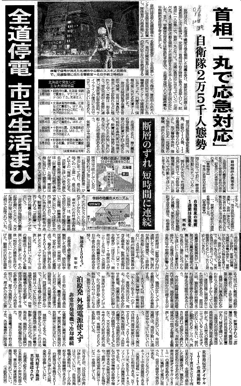 | [2018_09_06_43]首相「一丸で応急対応」自衛隊2万5千人態勢 断層のずれ 短時間に連続 全道停電 市民生活まひ 加速度1504ガル 安平町 6強程度の地震 1週間は注意を 気象庁 泊原発 外部電源使えず 非常用発電機で冷却継続 県内原子力施設以上確認されず (東奥日報2018年9月6日) |