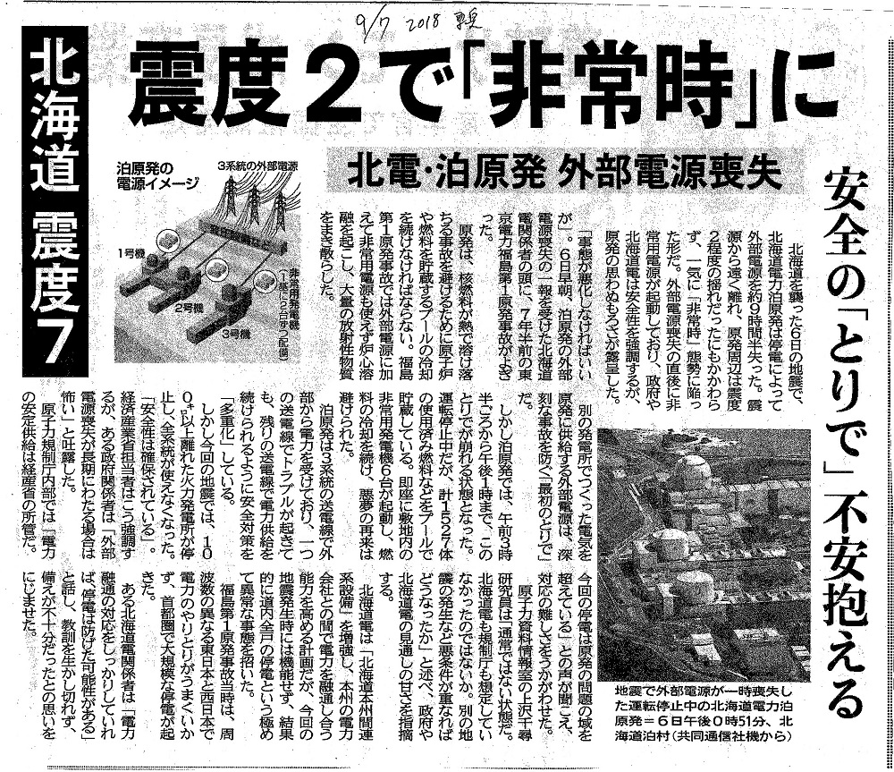 | [2018_09_07_28]北海道震度7 震度2で「非常時」に 北電・泊原発 外部電源喪失 安全の「とりで」不安抱える(東奥日報2018年9月7日) |