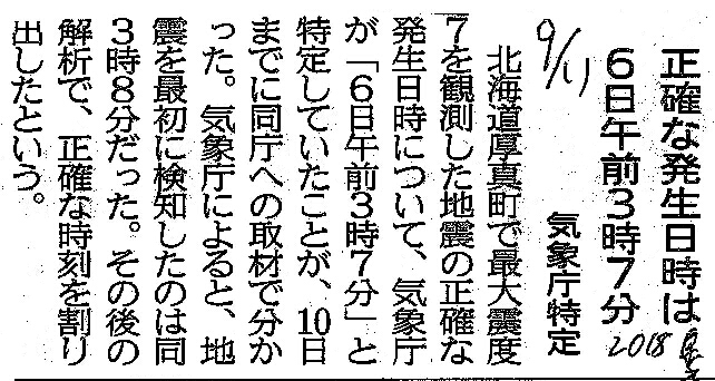 [2018_09_11_03]正確な発生日時は6日午前3時7分 気象庁特定(東奥日報2018年9月11日)