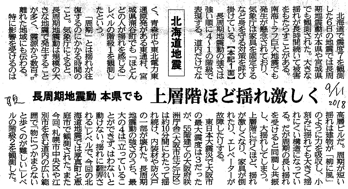 | [2018_09_11_05]北海道地震 長周期地震動 本県でも 上層階ほど揺れ激しく(東奥日報2018年9月11日) |