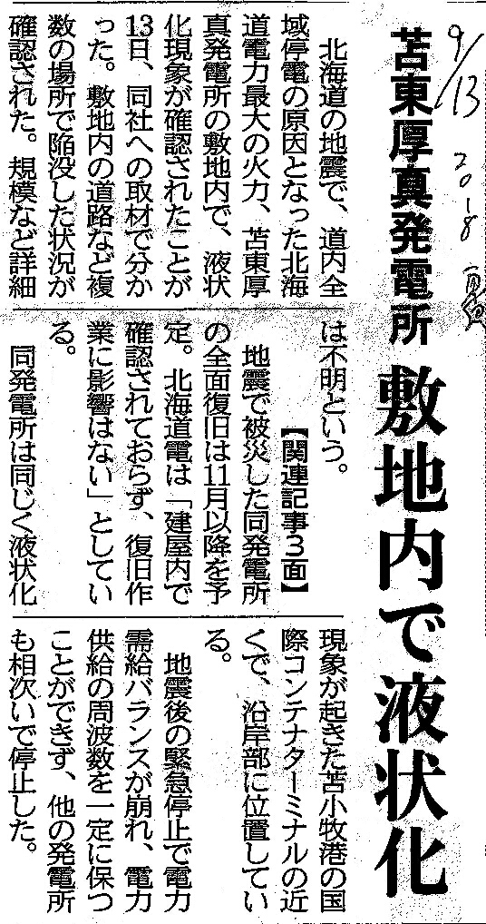 [2018_09_13_05]苫東厚真発電所 敷地内で液状化(東奥日報2018年9月13日)
