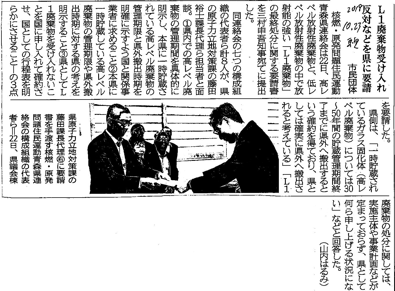 | [2018_10_23_02]L1廃棄物受け入れ 反対などを県に要請 市民団体(東奥日報2018年10月23日) |