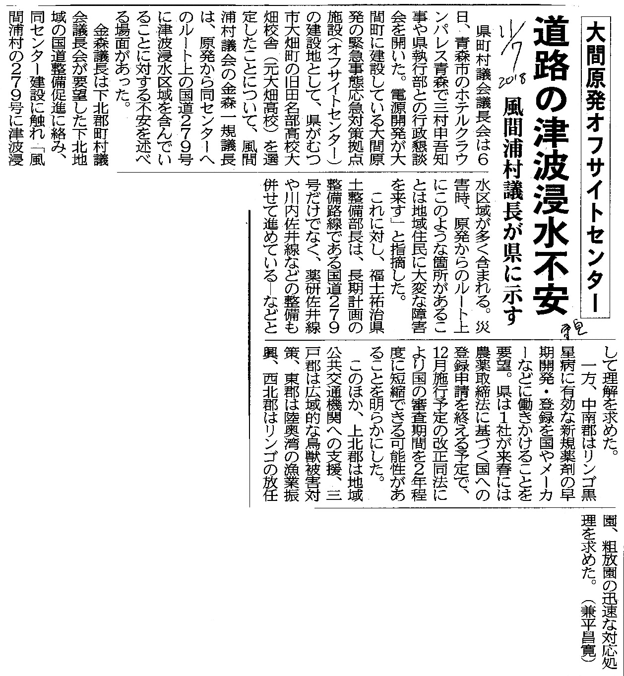 | [2018_11_07_07]大間原発オフサイトセンター 道路の津波浸水不安 風間浦村議長が県に示す(東奥日報2018年11月7日) |