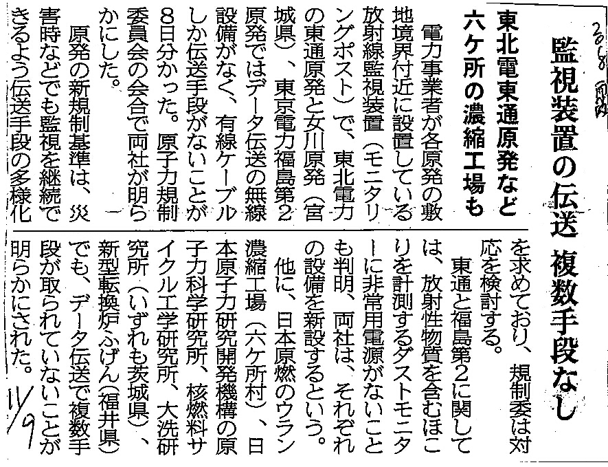 | [2018_11_09_06]監視装置の伝送 複数手段なし 東北電東通原発など六ケ所の濃縮工場も(東奥日報2018年11月9日) |